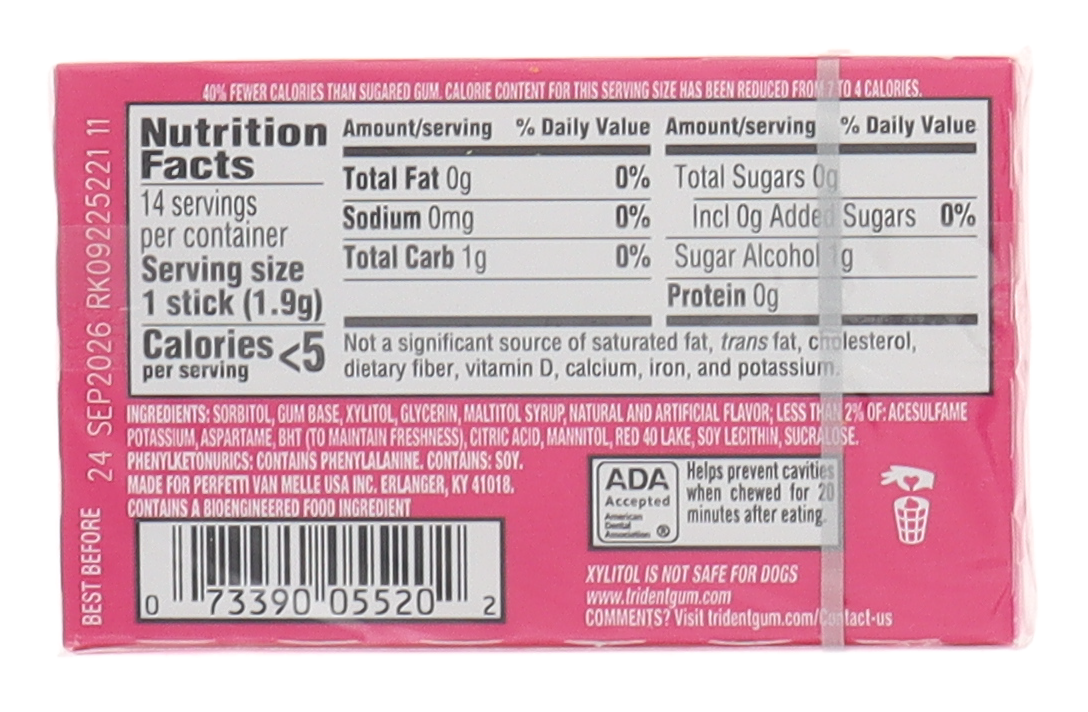 Ingredients: SORBITOL, GUM BASE, XYLITOL, GLYCERIN; LESS THAN 2% OF: ACESULFAME POTASSIUM, ASPARTAME, BHT (TO MAINTAIN FRESHNESS), CITRIC ACID, MANNITOL, NATURAL AND ARTIFICIAL FLAVOR, RED 40 LAKE, SOY LECITHIN, SUCRALOSE.PHENYLKETONURICS: CONTAINS PHENYLALANINE.